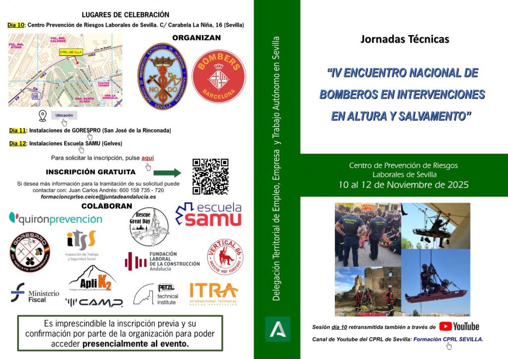 El próximo 10 al 12 de noviembre de 2025 se celebrará en EL CENTRO DE PREVENCION DE RIESGOS LABORALES DE SEVILLA, GORESPRO Y ESCUELA SAMU la actividad formativa: IV ENCUENTRO NACIONAL DE BOMBEROS EN INTERVENCIONES EN ALTURA Y SALVAMENTO.